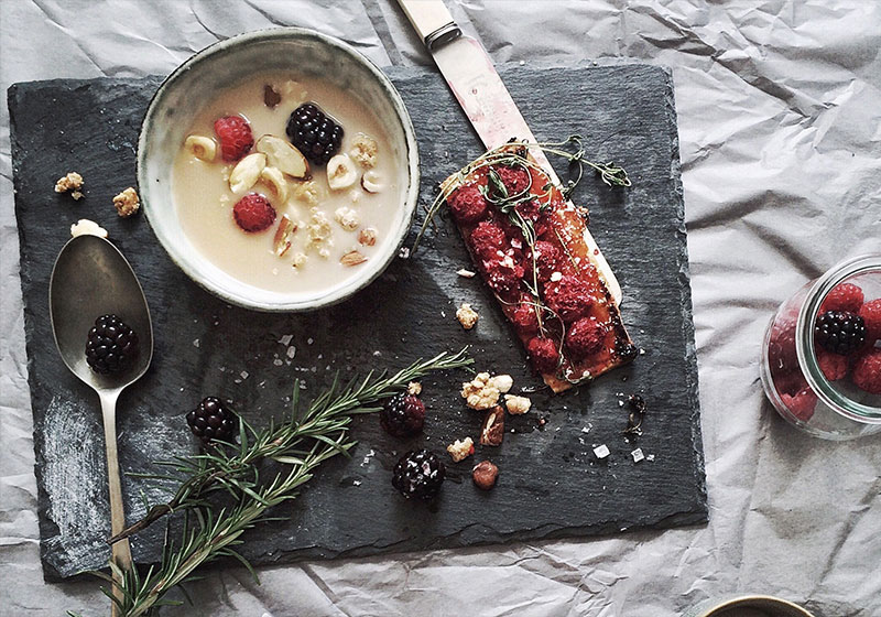 Cheesecake onctueux sur une base de biscuit, garni de coulis de framboises fraîches.